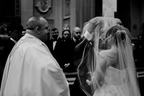 (Left) Nina's mother buttoning her dress with her veil, shoes, and sleeves in the background.